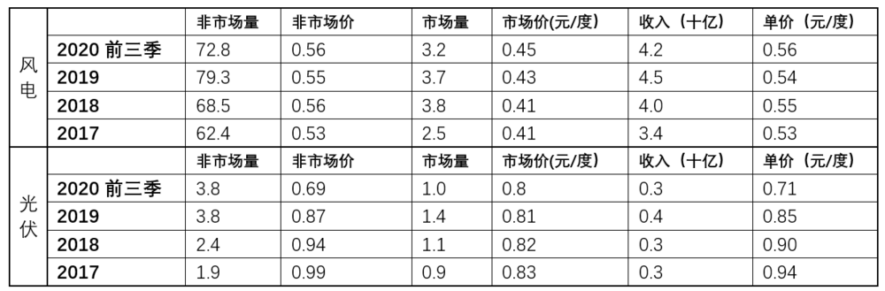 以2020年前三季为例,风电非市场销售72.8亿度、价格0.56元/度;市场销售3.2亿度、价格0.45元/度;总销售收入42亿、均价0.56元/度。有意思的是,光伏发电非市场价反而低于市场价。