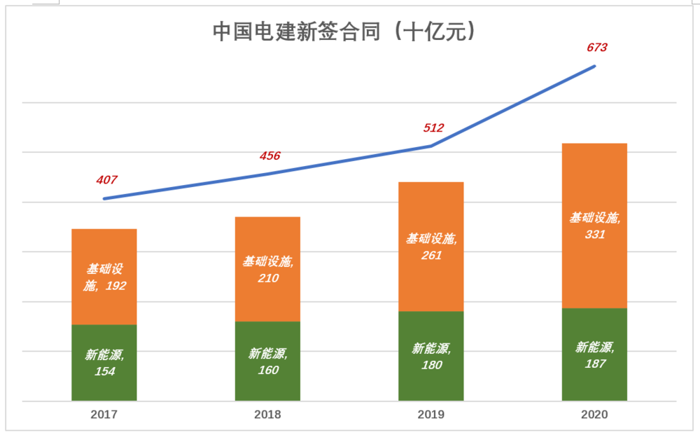 2020年,中国电建新签合同6733亿元、同比增长31.5%。其中清洁能源数合同金额达1866亿,包括江苏如东海上风电场(125亿)、三峡新能源山东平牟一期300MW海上风电(55亿)、内蒙芝瑞抽水蓄能电站(22亿)、河北易县抽水蓄能电站(19亿)……还有赞比亚三个200MW光伏项目(45亿)、越南平大310MW海上风电项目(36亿)……
