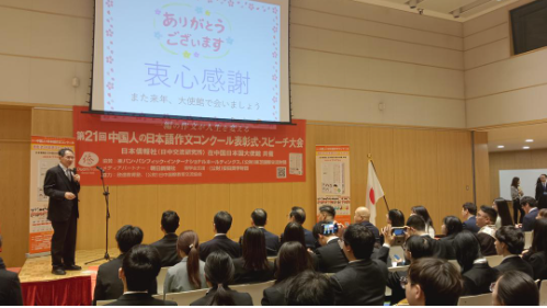 11月7日,由日本侨报社(日中交流研究所)与日本驻华大使馆联合主办的第21届全中国日语作文比赛颁奖典礼暨演讲大会在日本驻华大使馆隆重举行。日本驻华大使金杉宪治、大赛发起人、日本侨报社总编辑段跃中,以及来自全国多所高校的获奖选手代表、日籍指导教师及部分获奖学生家长共同出席了活动。